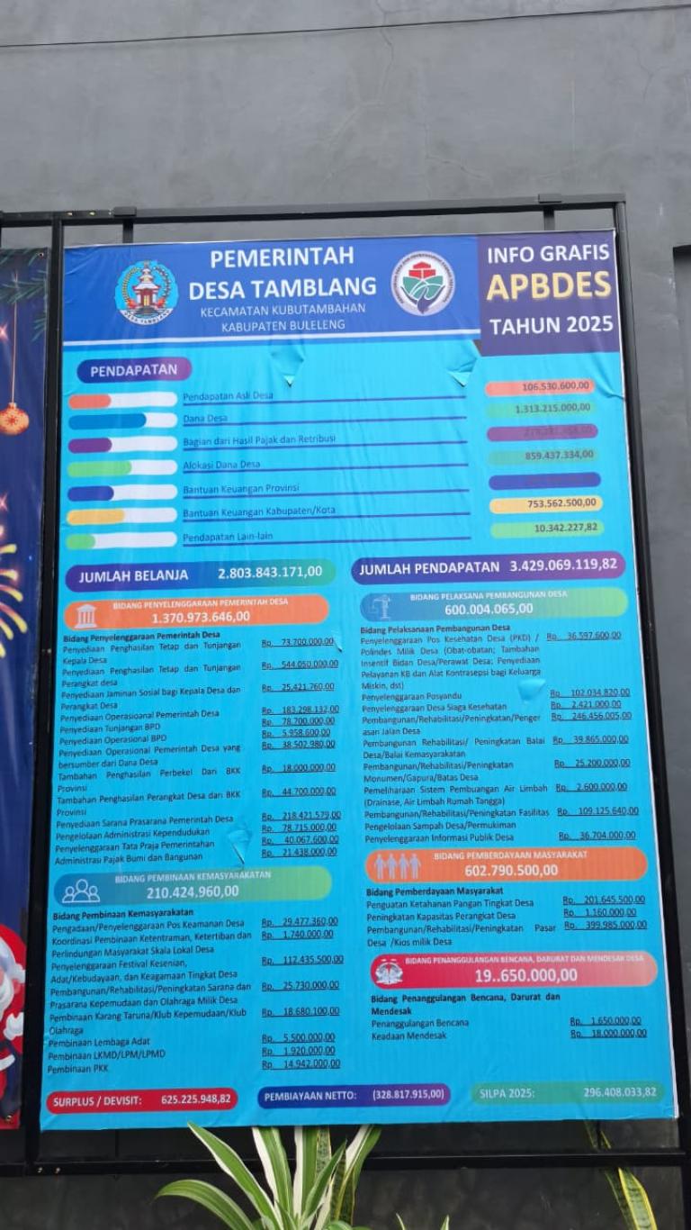 Infografis APBDesa merupakan instrumen transparansi dan akuntabilitas publik yang menyajikan ringkasan rencana pendapatan, belanja, dan pembiayaan Desa Tamblang untuk Tahun Anggaran 2025. Melalui visualisasi data yang komunikatif, Pemerintah Desa Tamblang berupaya mendekatkan informasi keuangan desa kepada masyarakat, sehingga warga dapat mengetahui dan mengawasi jalannya pembangunan desa secara partisipatif.
