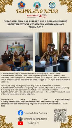 Kubutambahan,6 April 2026 bertempat di Ruang Rapat Kantor Camat Kubutambahan Perbekel Desa Tamblang menugaskan Staff Operator Desa Tamblang untuk mengahdiri Rapat Koordinasi Awal Kegian Festival Kecamatan Tahun 2026 yang akan dilaksanakan pada Tanggal 24 -26 April 2026 di Wantilan Desa Bila.