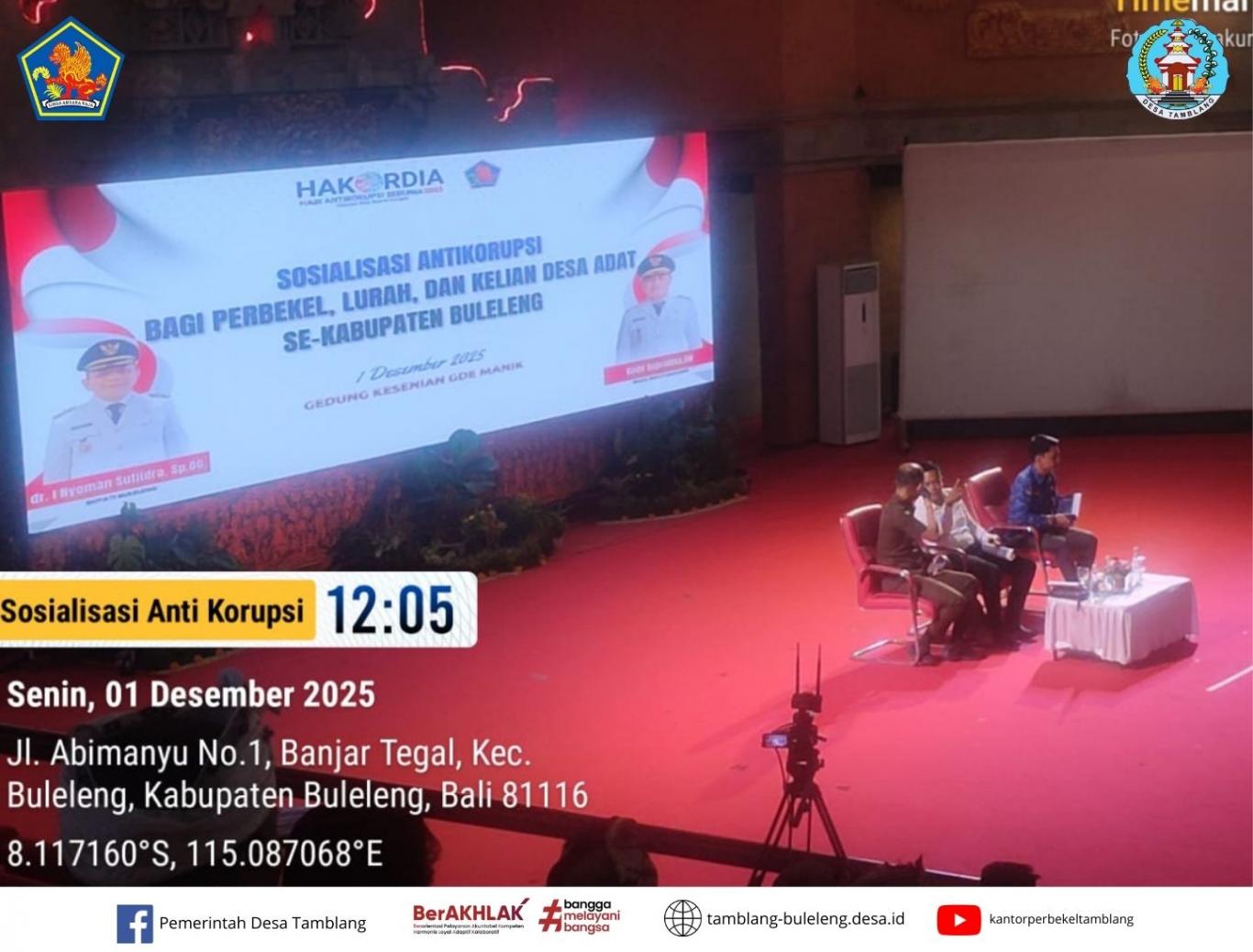 Pemerintah Kabupaten (Pemkab) Buleleng melalui Inspektorat Daerah memperluas langkah pencegahan korupsi hingga ke tingkat desa dengan menggelar Sosialisasi Hari Antikorupsi Sedunia (Hakordia) bagi Perbekel, Lurah, dan Klian Desa Adat se-Kabupaten Buleleng, bertempat di Gedung Kesenian Gde Manik Singaraja, Senin (1/12/2025). Langkah ini menjadi respon Pemkab Buleleng terhadap meningkatnya alokasi dana desa dan tanggung jawab besar yang melekat pada para pimpinan desa sebagai ujung tombak pelayanan publik. Transparansi, akuntabilitas, dan kehati-hatian dinilai mutlak, mengingat besarnya risiko penyimpangan anggaran di level pemerintahan paling dekat dengan masyarakat.